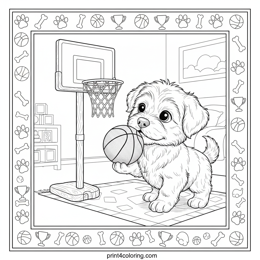 Join an adorable, fluffy puppy with big, curious eyes discovering basketball! Watch Fido gently nudge a small, textured ball with its nose and paw, dreaming of a slam dunk. This cozy scene features a miniature hoop in a warm room, promising hours of coloring fun for sports and animal lovers alike.