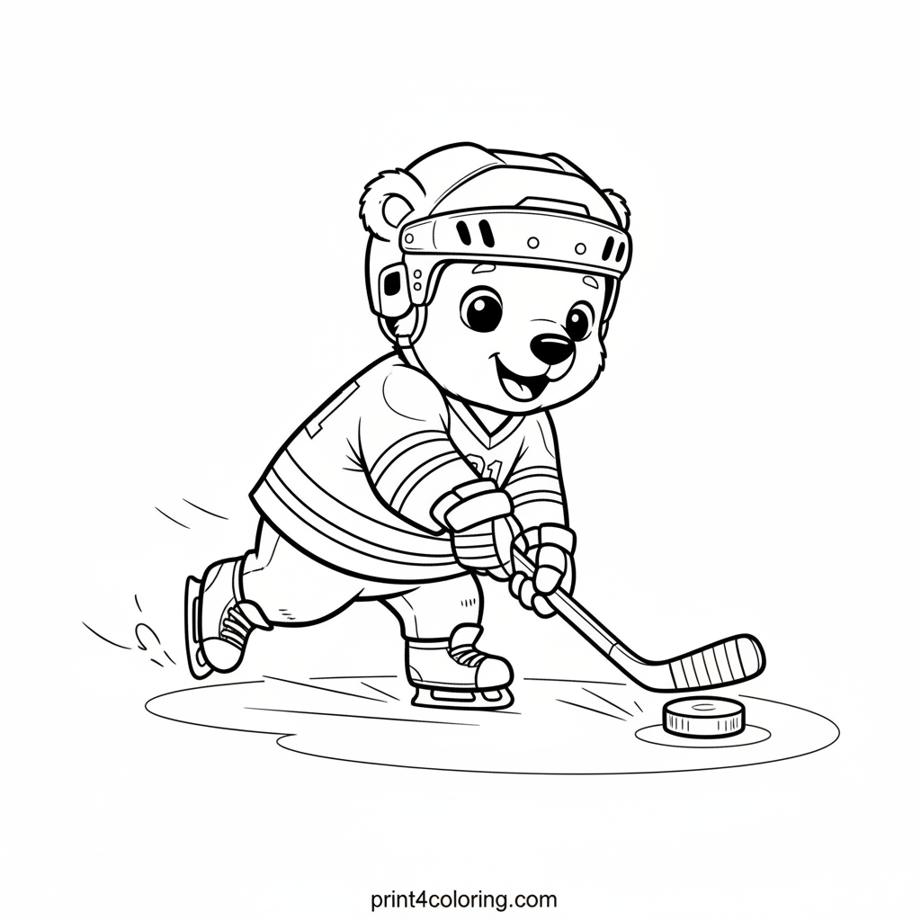 Imagine a super cute baby polar bear, all bundled up in a tiny helmet and jersey, wobbling on skates! This adorable cub is on a glistening ice rink, full of joy as it tries to tap a puck with its mini hockey stick. Get ready to add color to this heartwarming first try!
