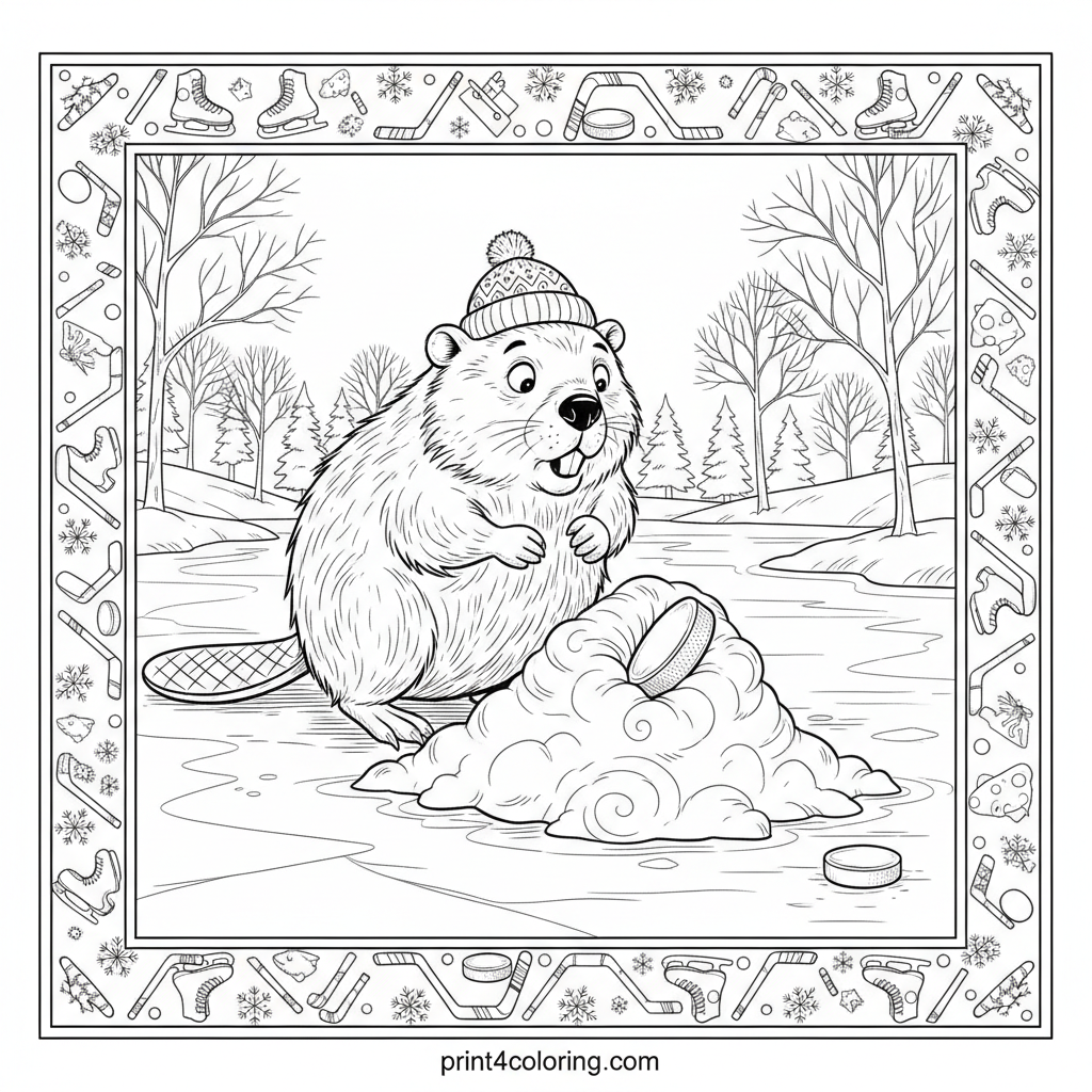 Pond Hockey Prank: Beaver's Snowy Surprise Coloring Page