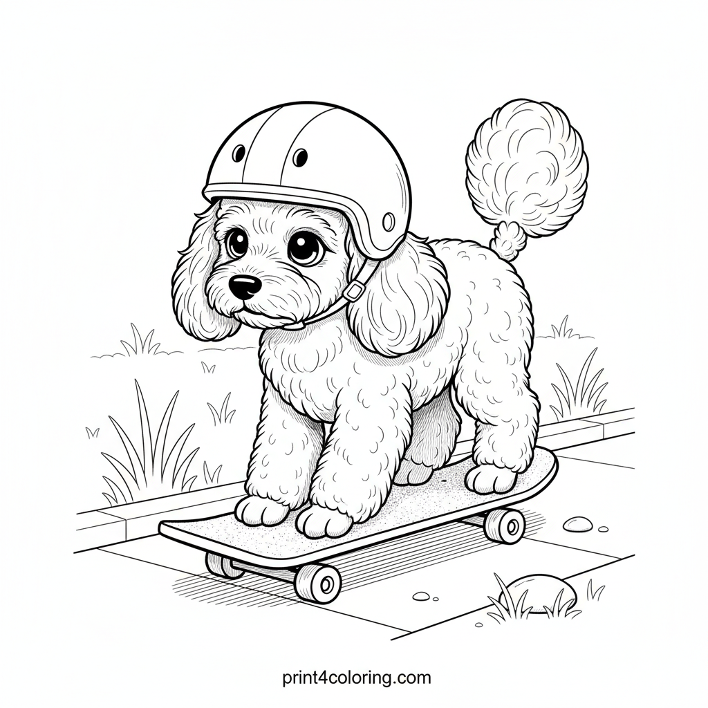 Get ready for a paw-some adventure with this charming coloring page! A fluffy poodle, sporting a tiny helmet, comically attempts to balance on a miniature skateboard. Its focused, slightly bewildered expression and raised tail add to the fun. Set on a sunlit sidewalk with detailed blades of grass, this expert page offers a delightful coloring challenge.