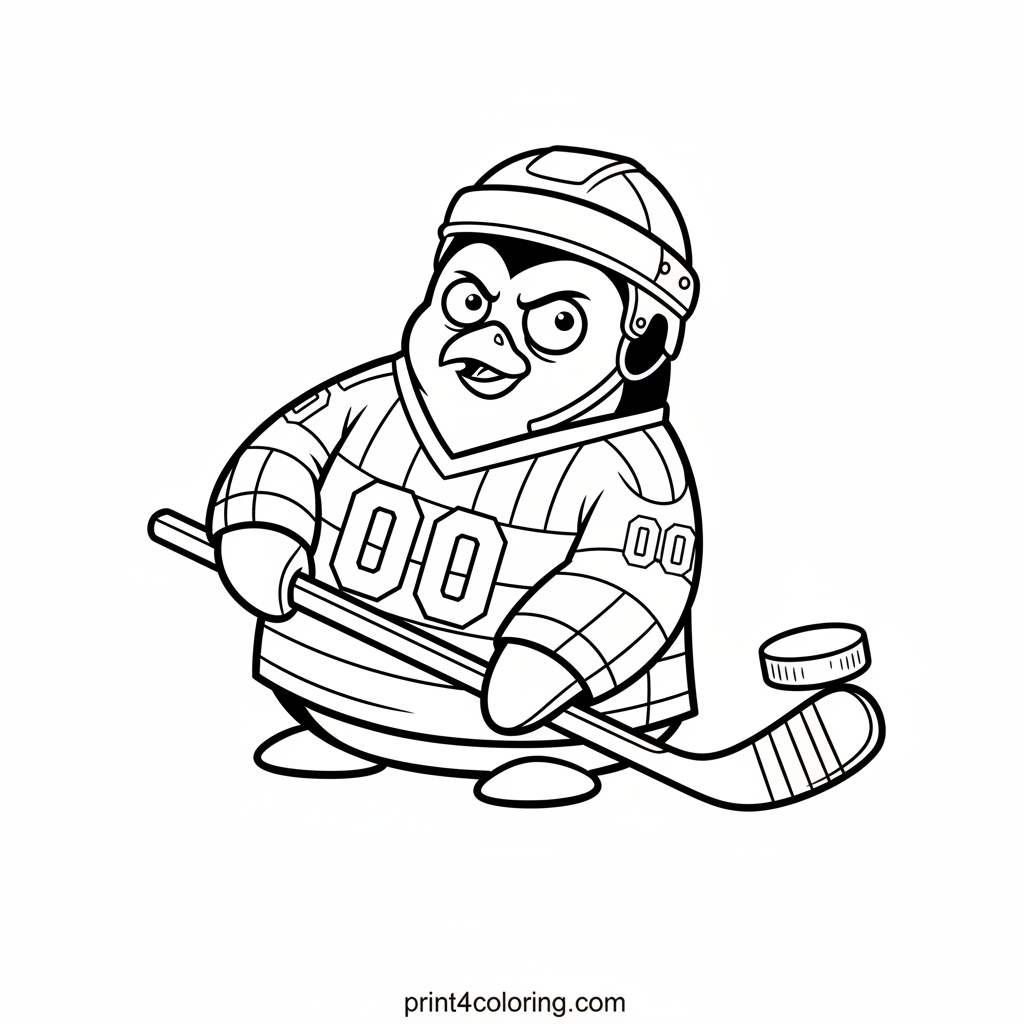 Join this adorable, clumsy penguin as it attempts a super silly hockey shot! Dressed in an oversized jersey and a tiny helmet, our feathered friend is trying its best to balance the puck on its stick, looking hilariously focused. This close-up portrait promises a fun coloring adventure, capturing the spirit of determination and a little bit of goofiness on the ice.