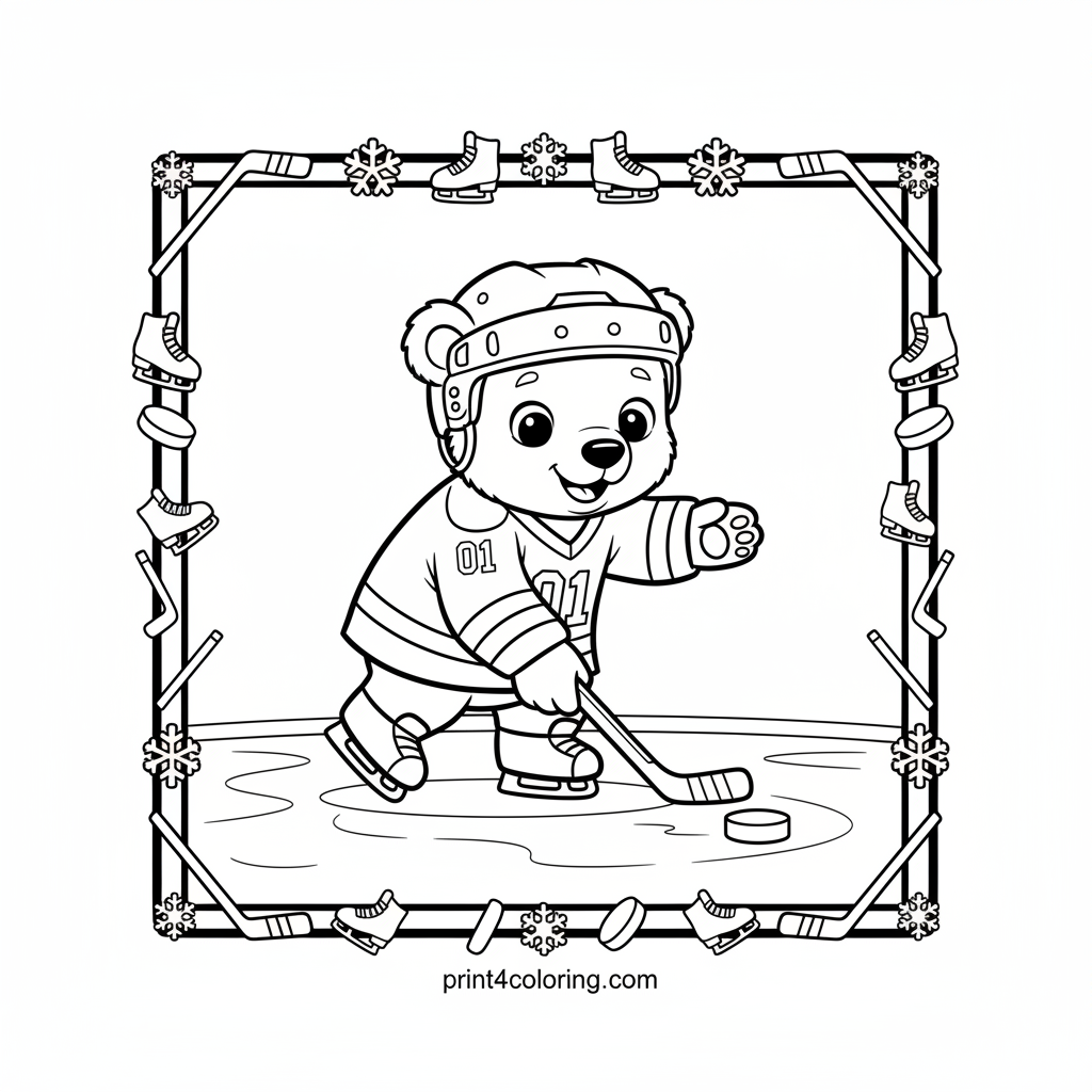 Get ready for an adorable ice adventure! This coloring page features a super cute polar bear cub, all bundled up in a tiny hockey helmet and jersey. Watch as it joyfully wobbles on skates, trying to tap a puck with its mini stick on a glistening ice rink. A heartwarming scene of winter fun and first attempts awaits your creative colors!