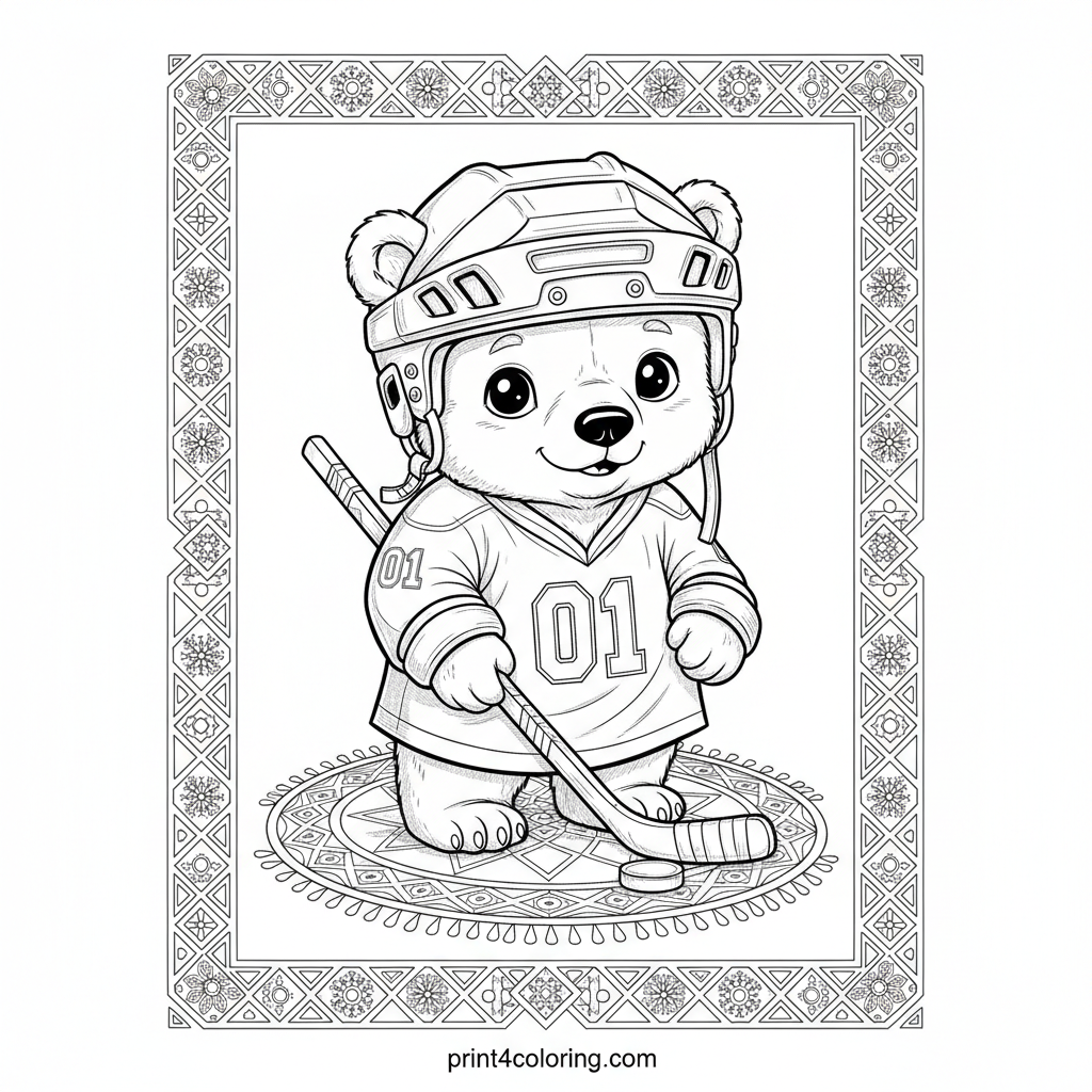Get ready for frosty fun with this adorable polar bear cub! Dressed in an oversized hockey helmet and jersey, this little athlete holds a tiny stick with big, curious eyes. The ice beneath him is a wonderland of intricate snowflake and geometric patterns, perfect for detailed coloring. A delightful scene for aspiring artists and hockey fans!