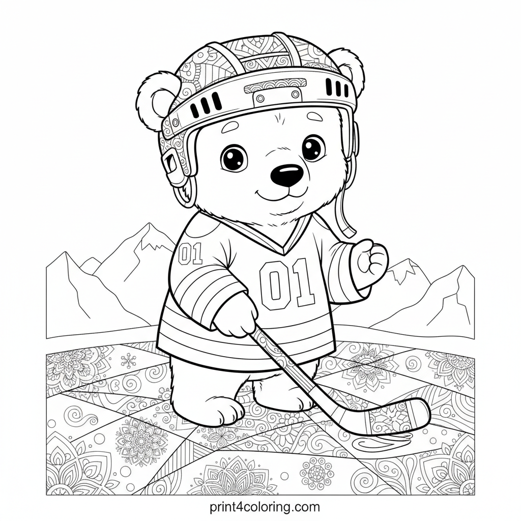 Meet our adorable polar bear cub, all bundled up in an oversized hockey helmet and jersey! With wide, curious eyes and a tiny stick, this little athlete is ready for the ice. The intricate snowflake patterns and geometric designs on the ice beneath make this a challenging and fun scene to color. Bring this charming winter sports adventure to life!
