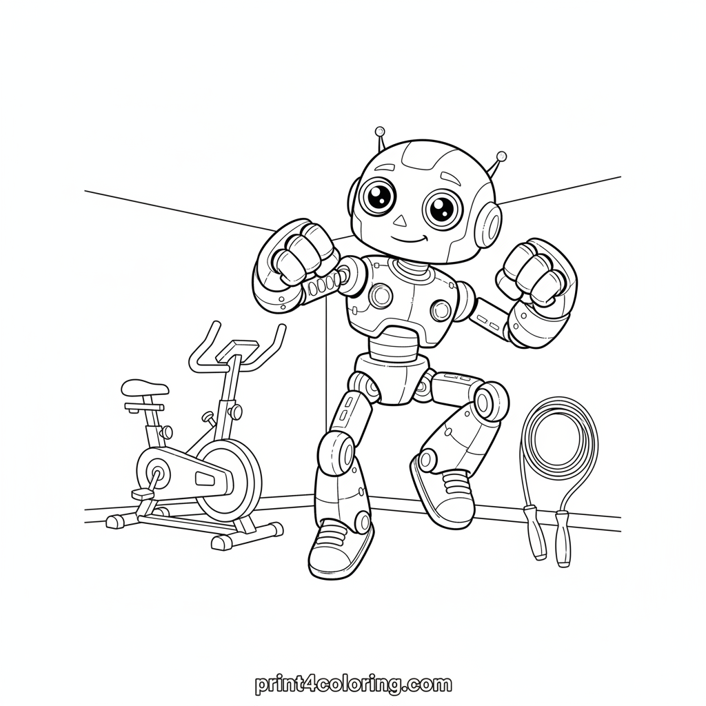 Join our friendly robot as it powers through an energetic workout! This detailed scene showcases an articulated robot performing dynamic stretches and playful shadow boxing in a modern, brightly lit gym. Find finely detailed exercise equipment like a stationary bike and jump rope, ready for your creative colors.