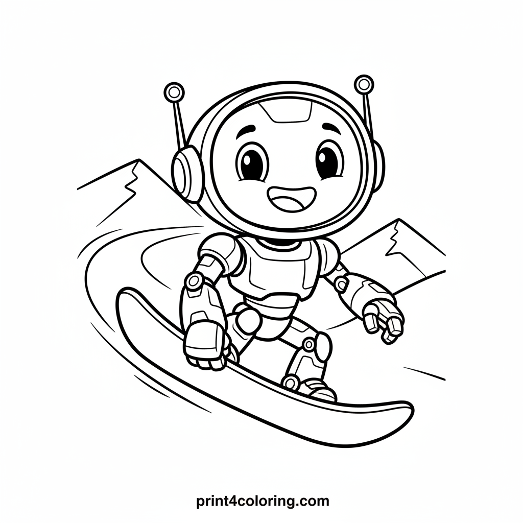 #robot#snowboarding#winter#mountain#adventure#futuristic#coloring-page#printable