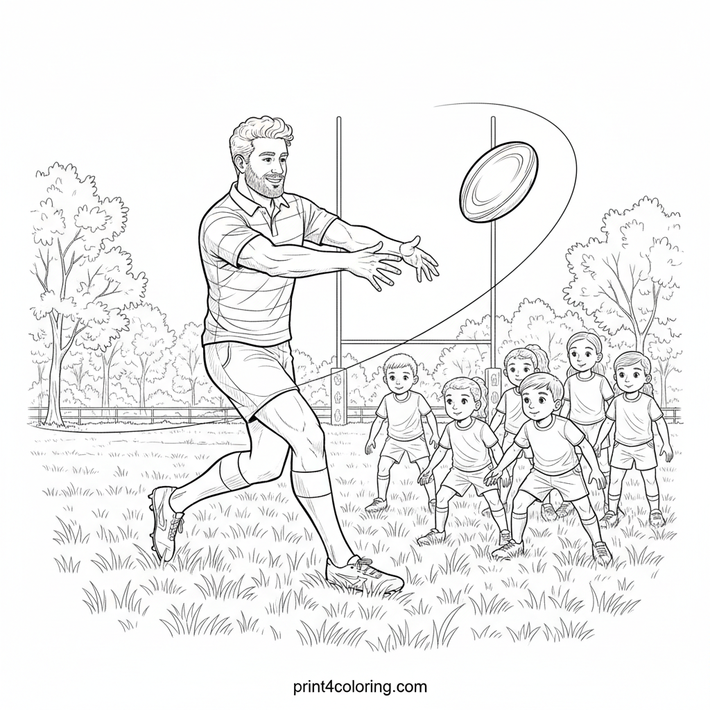 Watch a friendly coach demonstrate the perfect rugby pass to an eager group of children. This detailed scene captures the excitement of learning on a finely sketched grassy field, complete with intricate goalposts and distant trees under a clear sky. Color this dynamic moment and imagine mastering the game!
