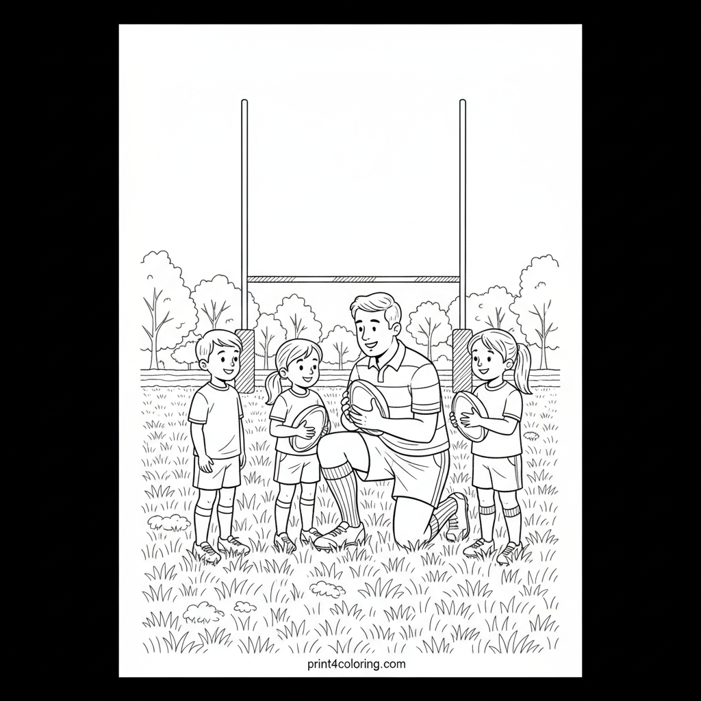 Watch a friendly coach demonstrate the perfect rugby pass to an attentive group of children. This detailed scene features realistic figures on a lush grassy field, complete with towering goalposts and distant trees under a clear sky. A fantastic way to color and learn about teamwork!