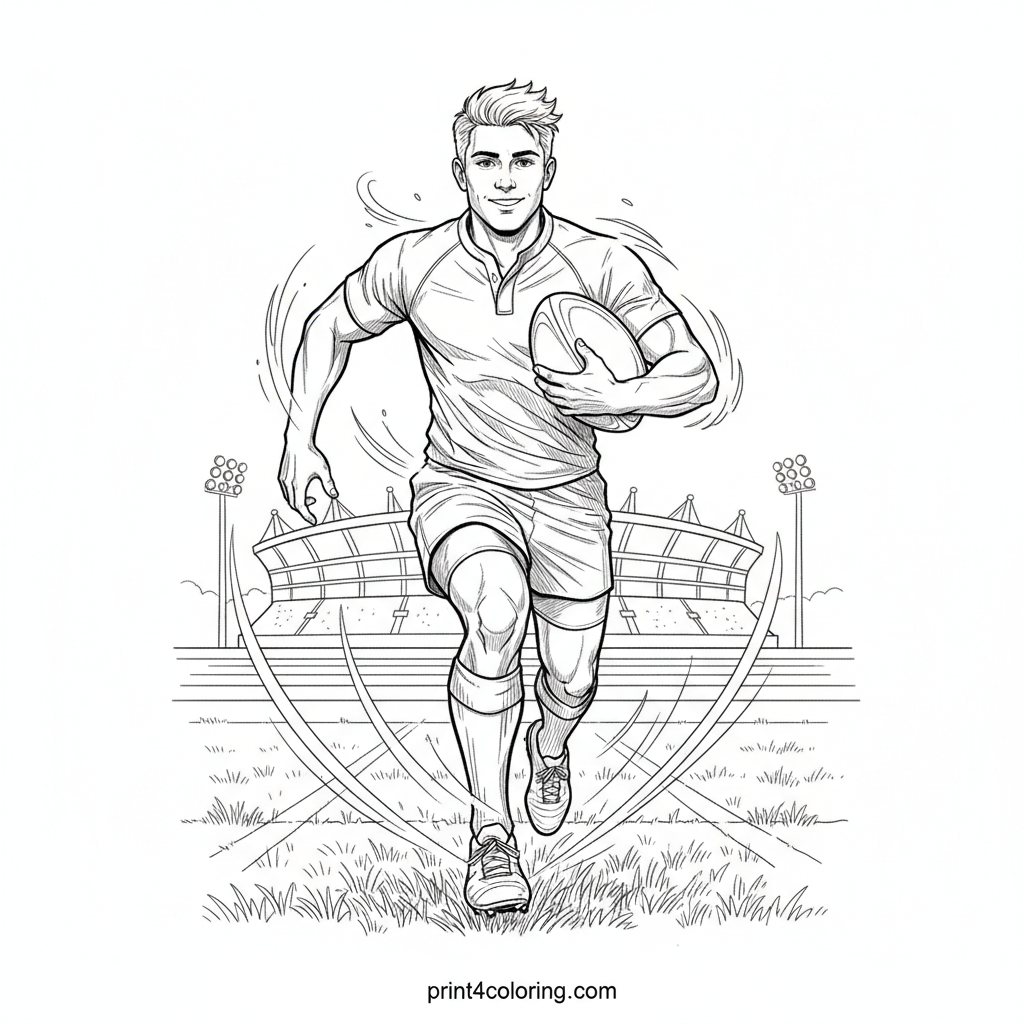 Experience the excitement of the rugby pitch! This challenging coloring page showcases a determined young athlete, mid-stride, carrying a textured rugby ball. Detailed jersey folds and dynamic lines capture their powerful dash across the finely rendered grassy field. Perfect for sports enthusiasts ready for a complex coloring adventure!