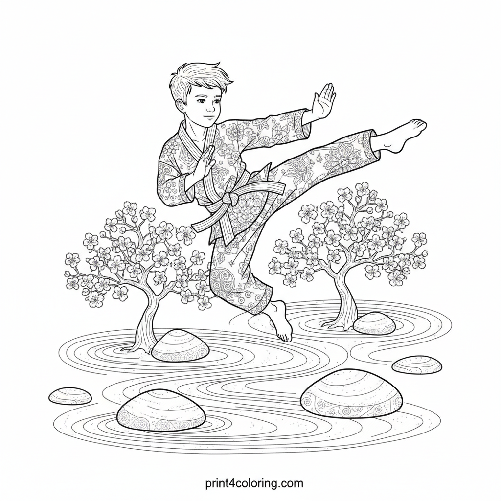 #zen-garden#karate#martial-arts#cherry-blossom#action-pose#focus#coloring-page#printable