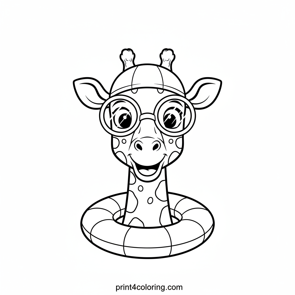 Dive into fun with this hilarious coloring page! A tall, friendly giraffe, sporting oversized goggles and a funny swim cap, is having a comical first swim lesson in a shallow pool. With a little floatie helping, our giraffe looks a bit surprised but totally happy to be learning something new.