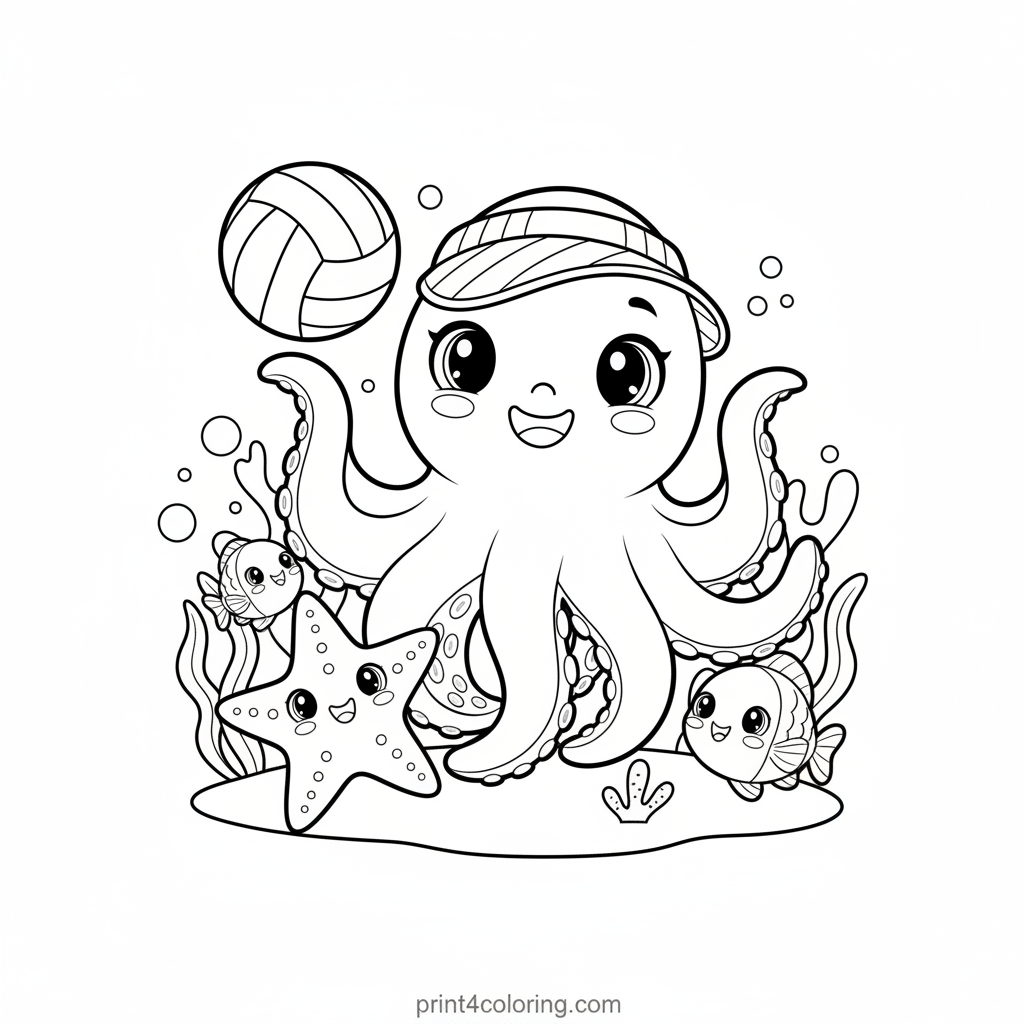 Dive into a super silly underwater game! Our friendly octopus, sporting a funny striped visor, is a volleyball superstar, using its many arms to expertly set and spike the ball. Happy fish and crabs cheer from the sidelines, creating a cozy and joyful marine sports scene. Get ready to add vibrant colors to this amazing aquatic athlete!