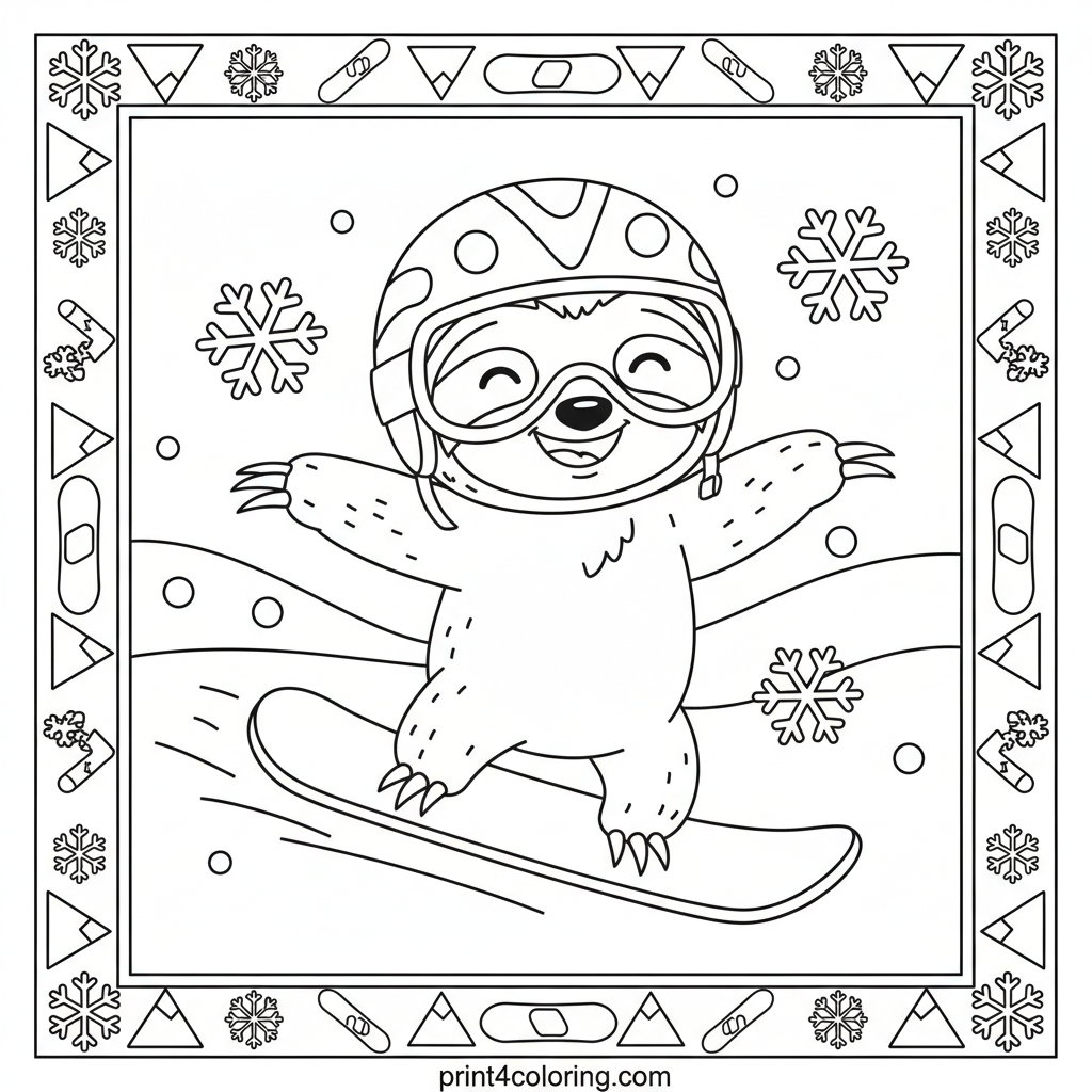 Join our super silly sloth as he takes on the snowy slopes! With a big, happy smile, a funny bright helmet, and oversized goggles, this friendly fellow is slowly but surely cruising down the mountain on his snowboard. Grab your crayons and add vibrant colors to his winter wonderland adventure, making his gear pop and the snow sparkle!