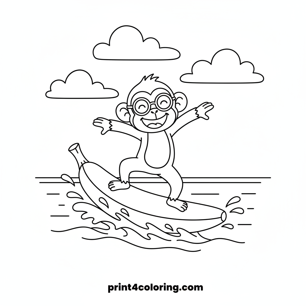 Silly Surfing Monkey on a Banana Wave Coloring Page
