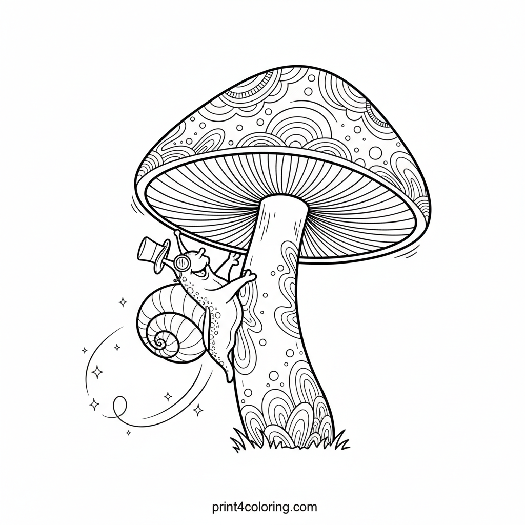 Join Sir Reginald, the most dapper snail, on his grand adventure! Wearing his tiny top hat and monocle, he's humorously 'rock climbing' a giant, wonderfully patterned mushroom. Follow his sparkling trail as he scales the textured cap with his special suction feet. A whimsical scene perfect for imaginative coloring!