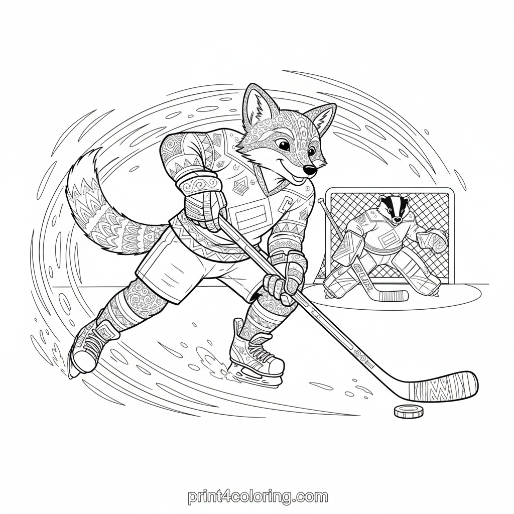Get ready for an action-packed ice hockey scene! A nimble fox player streaks across the ice, stick ready to shoot, leaving a cool trail of intricate zentangle patterns. Can the brave badger goalie block the shot? Add your vibrant colors to this dynamic moment of skill and speed, bringing the excitement of the game to life!