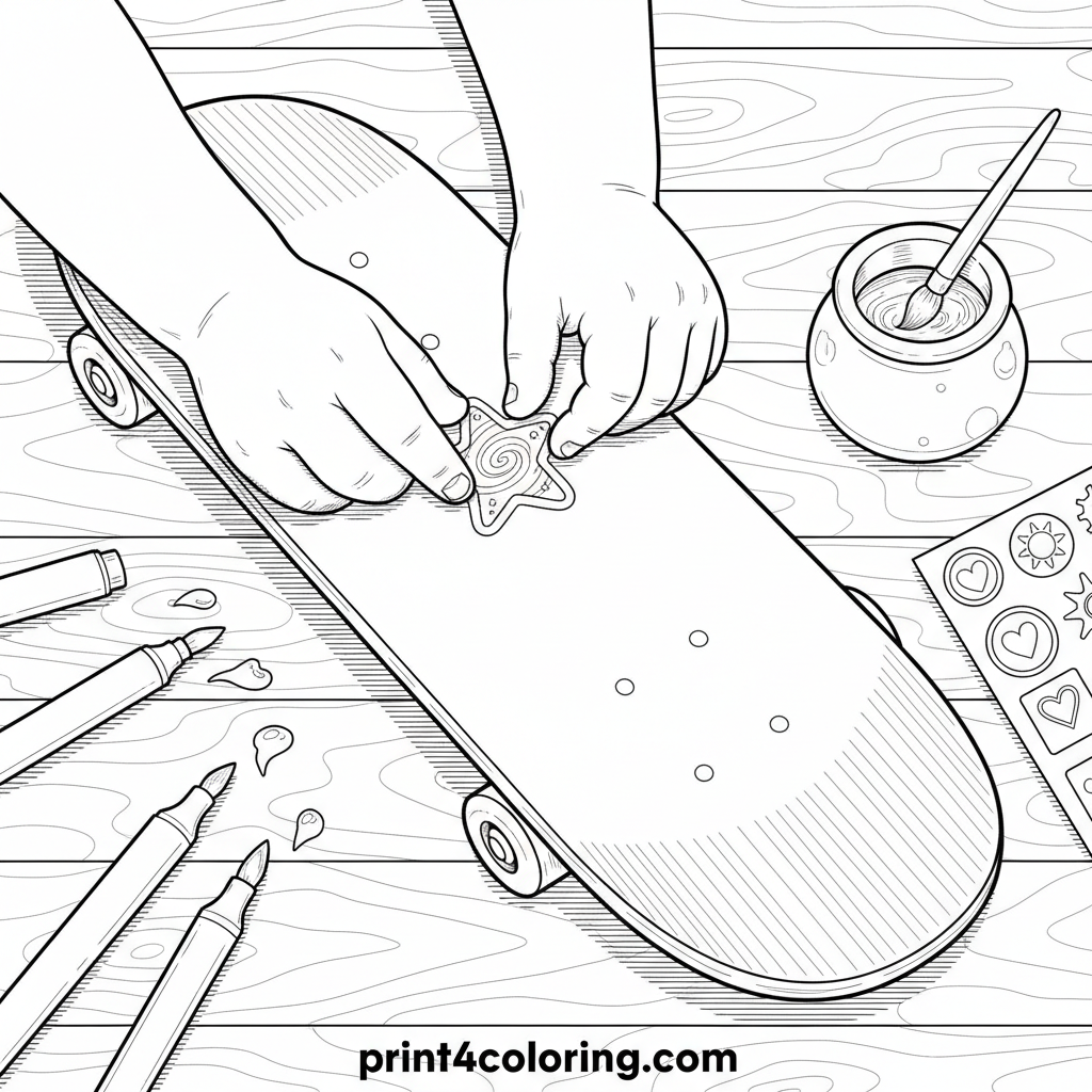 Dive into the world of skateboard customization! This detailed coloring page shows a child's hands carefully adding a cool sticker to their board. Explore vibrant art supplies like markers and paints, all neatly arranged on a wooden surface. Imagine the awesome designs you can create with your colors!