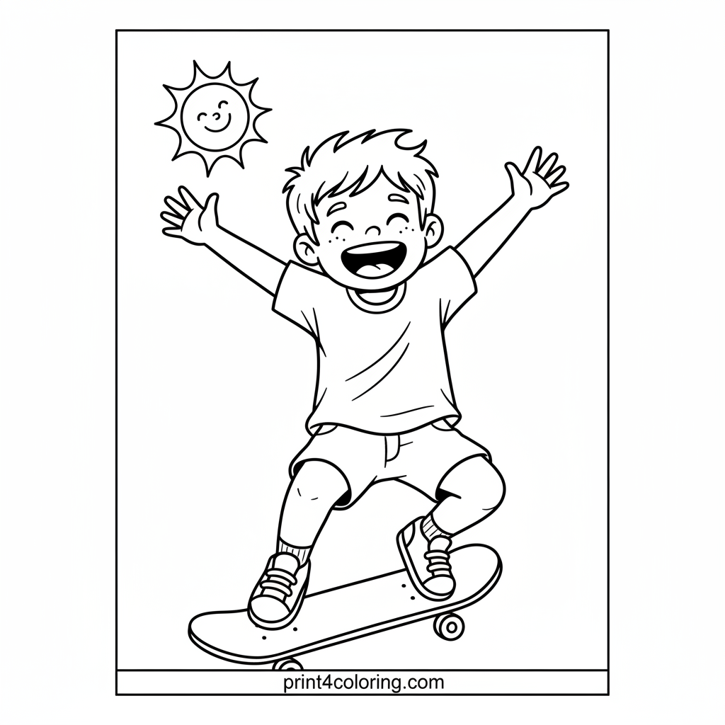 Witness the thrilling moment a happy child soars mid-air on their skateboard! Arms spread wide in pure joy, they've just leaped over a tiny, friendly puddle. A simple, cheerful sun smiles. Grab your crayons to color this awesome jump, celebrating courage and fun with vibrant hues!