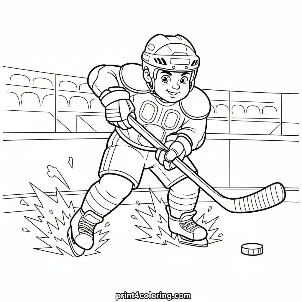 Feel the thrill of the ice! This action-packed coloring page features a young hockey player mid-skate, winding up for an incredible shot. Watch ice shavings fly as they aim for the goal with fierce concentration. Get ready to add vibrant colors to this exciting moment of sports glory!