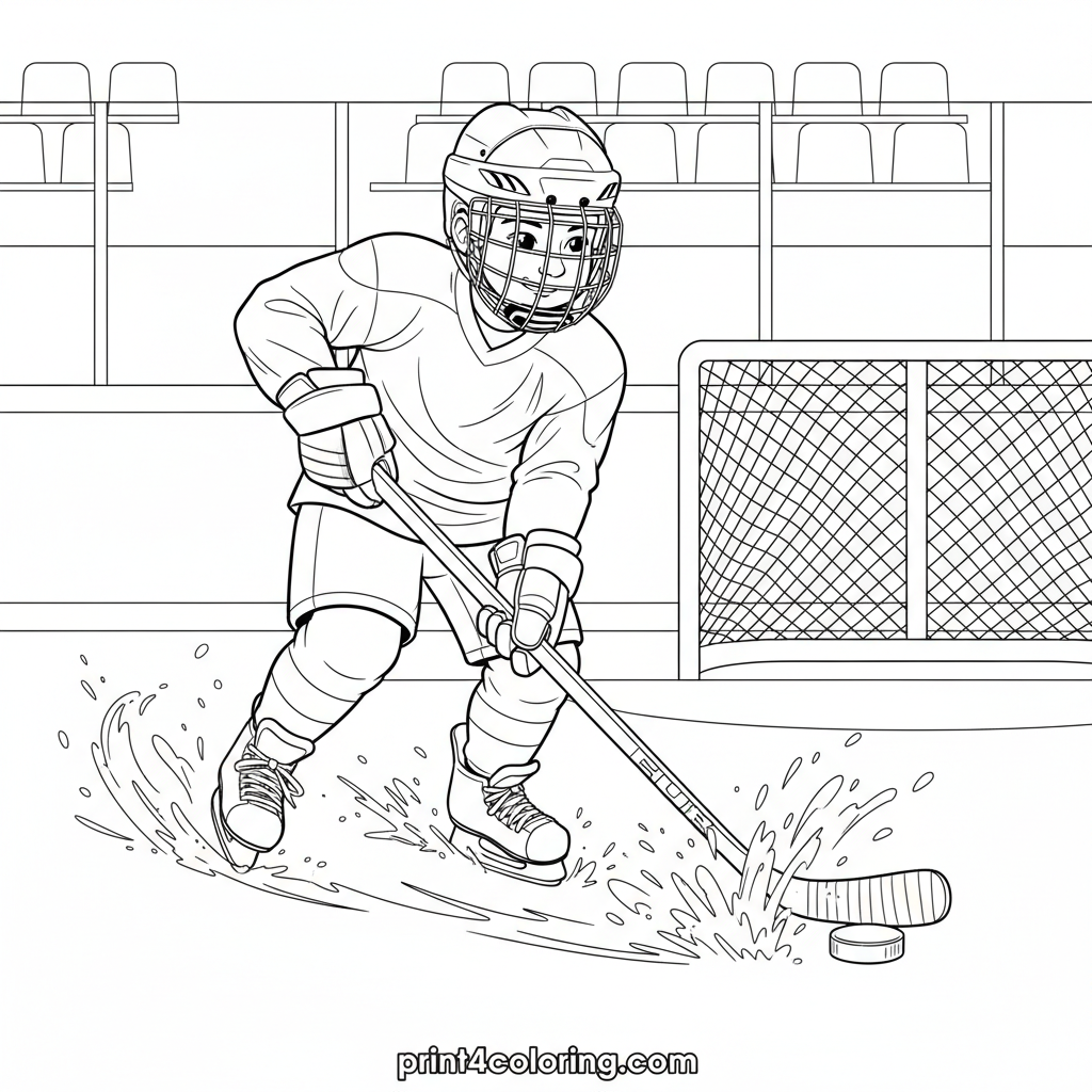 Get ready to color an exciting moment on the ice! This detailed scene captures a hockey player mid-shot, sending the puck flying. Watch the ice shavings spray from their powerful skates and admire the realistic uniform details. A thrilling picture for sports fans to bring to life with vibrant colors!
