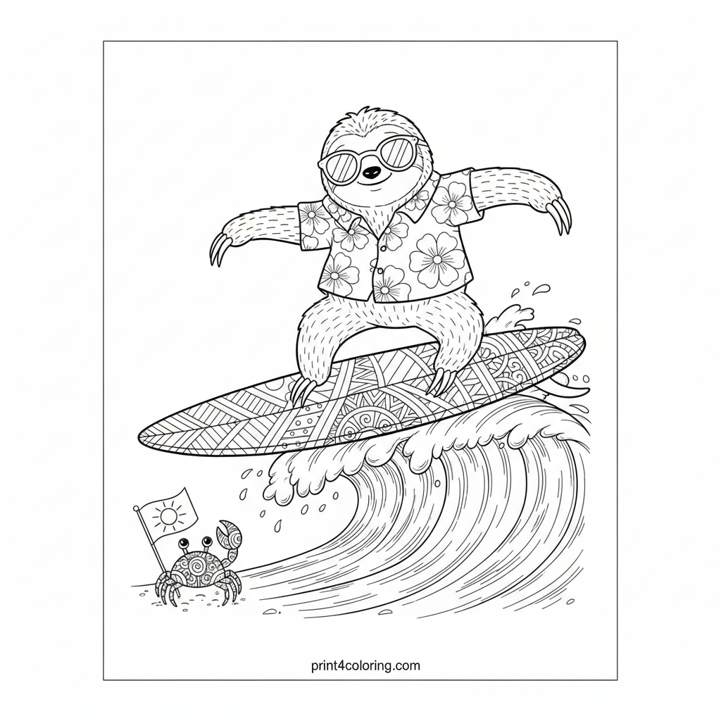 Hang ten with our chill sloth, rocking oversized sunglasses and a Hawaiian shirt, as it masterfully glides on a vibrant surfboard over a perfect wave. A tiny crab with intricate zentangle shell patterns cheers from the sand. Get ready to color this hilariously relaxed beach adventure!