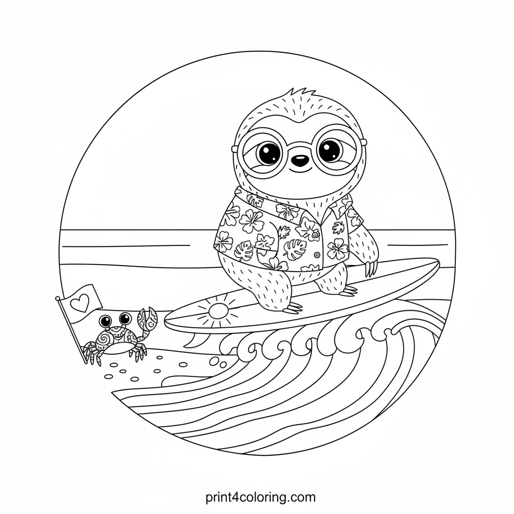 Join a super chill sloth as it catches a wave in the most relaxed way possible! Wearing cool sunglasses and a Hawaiian shirt, this laid-back surfer slowly glides on its extra-long board. A tiny crab with a fancy shell watches from the sandy beach. Get ready for a wonderfully slow and sunny coloring adventure!