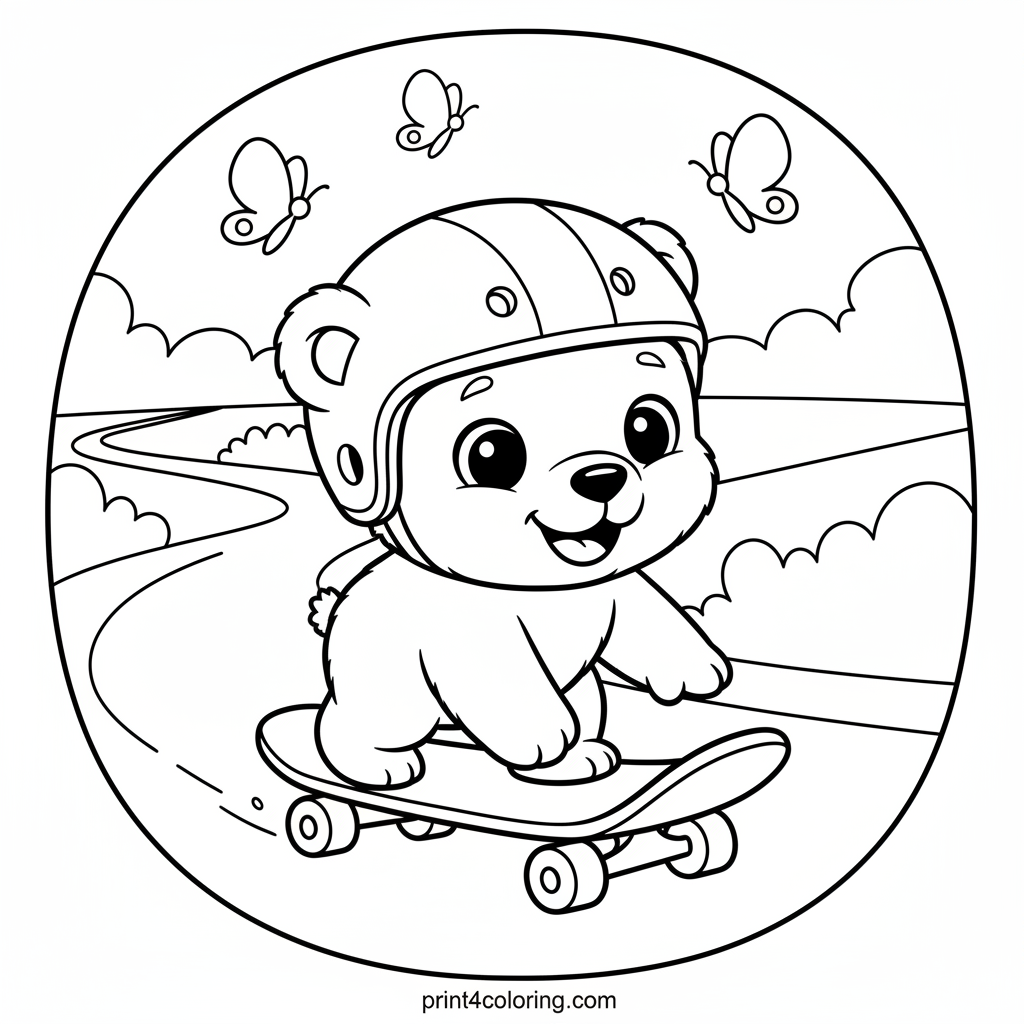 Join a happy bear cub on its very first skateboard ride! Wearing a tiny helmet, this brave cub is carefully pushing off on a colorful board along a smooth park path. Friendly butterflies flutter nearby, adding charm to this adorable outdoor adventure. A perfect scene for young artists!