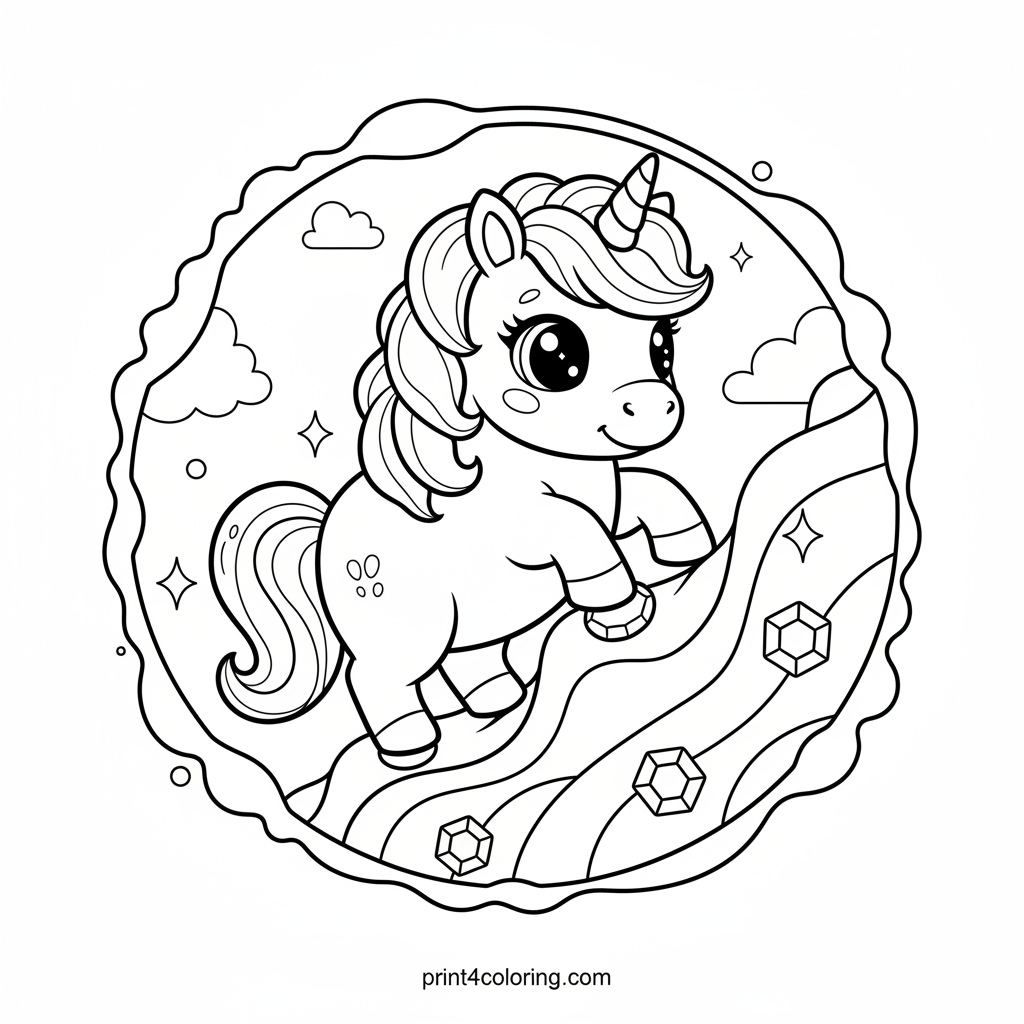 Join Sparklehoof, a gentle unicorn with a warm smile, as she embarks on an amazing adventure! Watch her carefully ascend a magnificent cliff, dazzling with all the colors of the rainbow. Her hooves find perfect spots among shimmering gems, making every step a magical journey. Get ready to add your own vibrant colors to this cozy, enchanting scene!