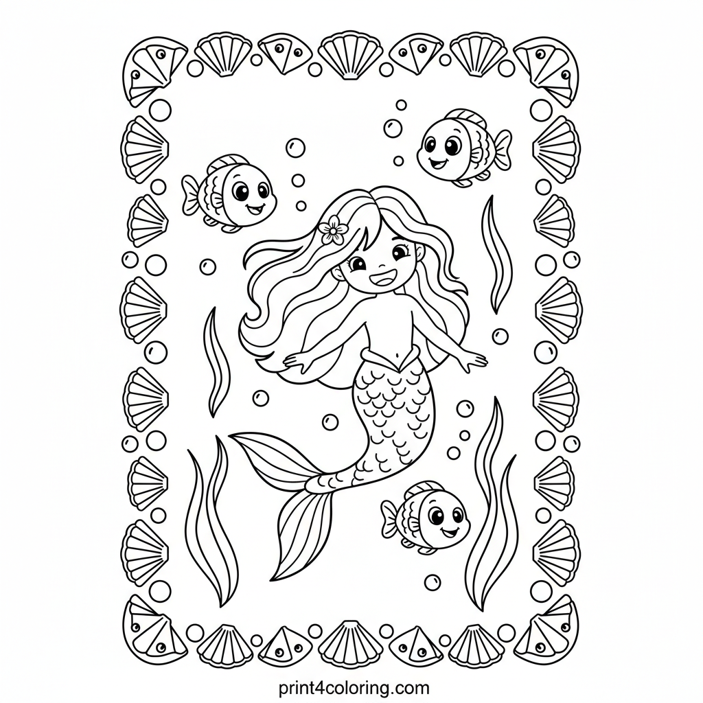 Dive into a wondrous underwater world! This page features a cheerful young mermaid with a sparkling tail, gracefully swimming in a vibrant lagoon. She's surrounded by friendly, colorful fish and gentle kelp, waiting for your creative touch to bring it to life! Perfect for aspiring ocean explorers.