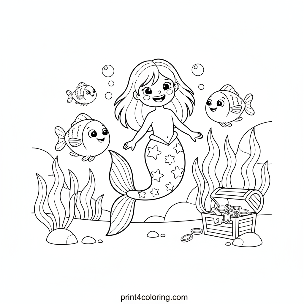 Dive into a magical underwater world with a cheerful young mermaid! Her sparkling tail glides through a vibrant lagoon, surrounded by smiling, colorful fish and gentle, swaying kelp. Bring this enchanting scene to life with your favorite colors and imagine the wonders of the deep sea.