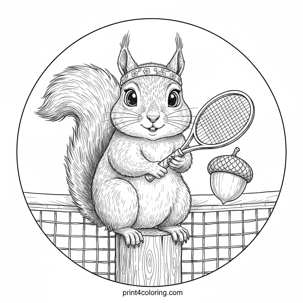Get ready for a sporty adventure with our 'Squirrel's Acorn Ace' coloring page! A finely detailed, mischievous squirrel, wearing a tiny headband, is poised on a tennis net post. Watch as it bats an acorn mid-air with a miniature tennis racket, showing a determined yet surprised expression. The intricate tennis net awaits your colorful touch!