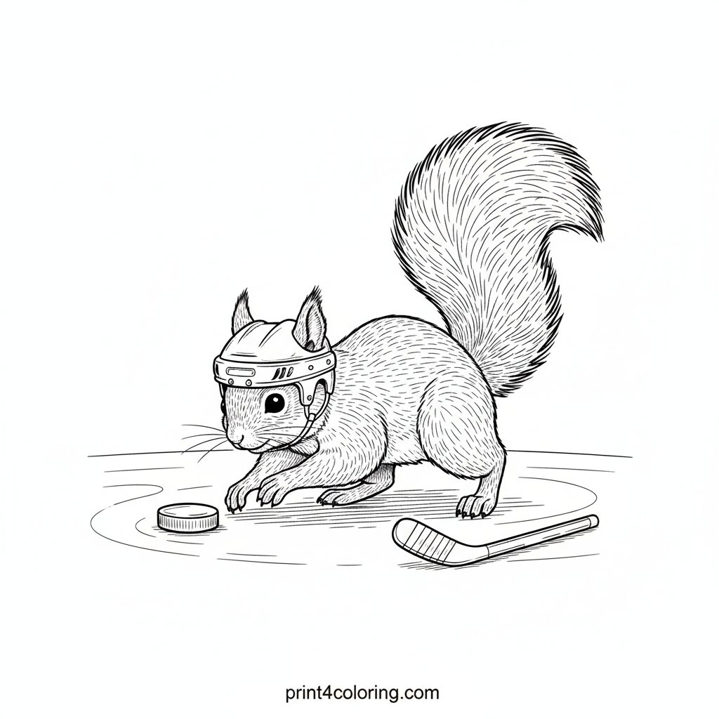 Join a clever squirrel on a thrilling ice rink adventure! This bushy-tailed friend, sporting a tiny hockey helmet, playfully nudges a puck across the smooth, reflective ice. Its curious and determined pose, with a little hockey stick nearby, invites you to bring this frosty scene to life with your favorite colors.