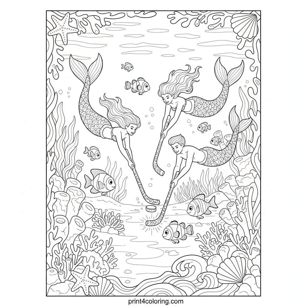 Dive into an extraordinary underwater hockey game! Graceful mermaids and mermen glide through vibrant kelp forests, wielding coral sticks and shimmering pucks. Detailed ocean flora, curious fish, and dancing sunlight fill this magical scene, inviting your most vibrant colors.