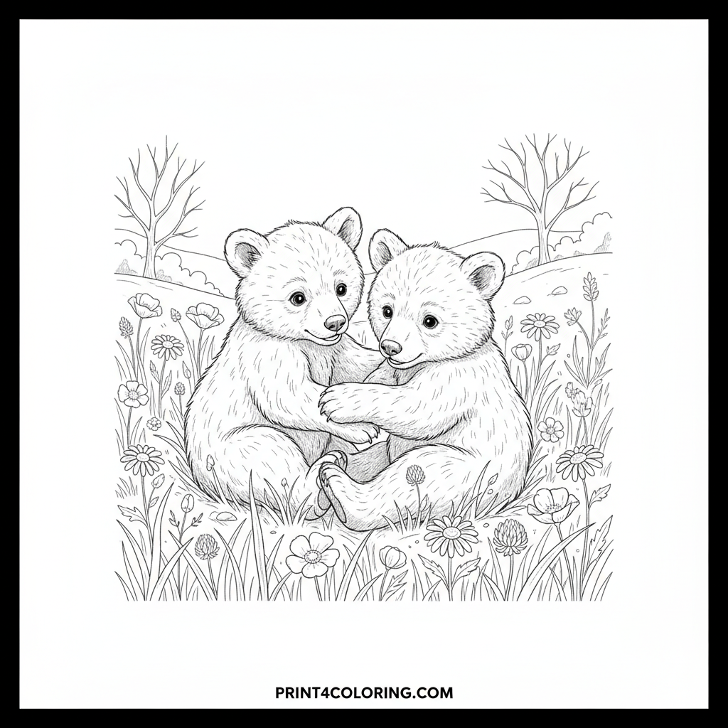 Dive into a heartwarming scene of two fluffy bear cubs joyfully tumbling and playing in a vibrant, sun-dappled meadow. Delicate wildflowers bloom amidst tall grasses as these curious little bears explore their world, their soft fur and big eyes inviting you to bring this playful moment to life with your favorite colors.