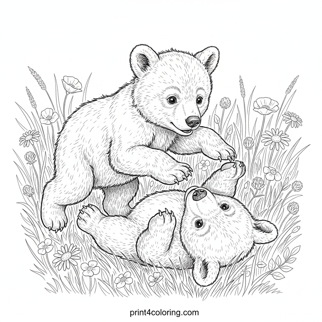 Dive into a delightful scene where two adorable bear cubs playfully tumble and wrestle in a sunny meadow. Their soft fur and curious eyes invite you to bring them to life amidst a field of finely detailed wildflowers and tall grasses. Imagine their happy growls as they enjoy their day in nature's embrace!