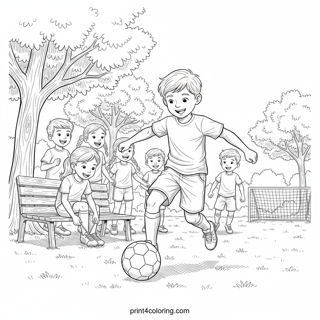 Join a lively group of diverse children as they enjoy a friendly soccer game in a beautiful, sunny park. Watch one child skillfully dribble the ball while friends tie shoelaces or cheer them on. This detailed scene with lush trees and a distant goal promises hours of creative coloring fun for all ages.