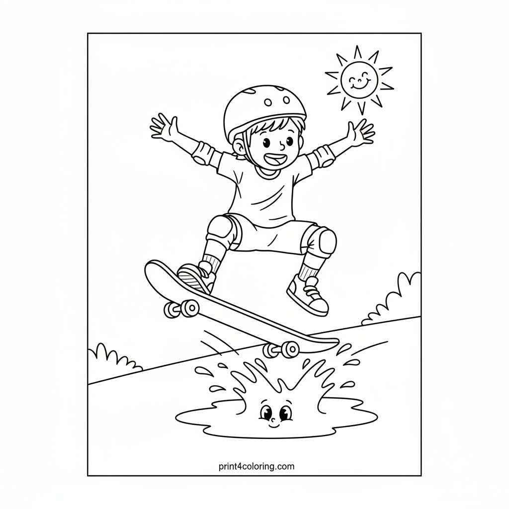 Get ready for an awesome adventure with this coloring page! A super happy child is soaring through the air on their skateboard, having just leaped over a friendly little puddle. Their arms are wide open in pure joy under a bright, simple sun. Grab your colors and bring this exciting moment to life!