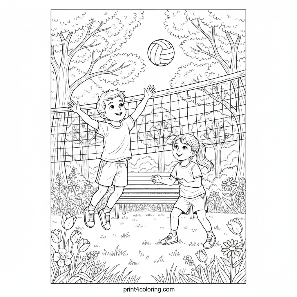 Join two friends in a lively park volleyball match! They're focused on the ball, surrounded by lush trees, vibrant flowers, and a cozy park bench. This detailed scene captures a sunny afternoon, with a clear net and individual grass blades. Bring this joyful outdoor moment to life with your colors!