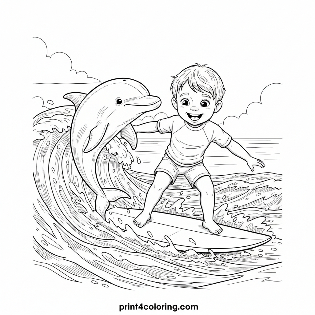 #dolphin#surfing#ocean#child#waves#marine-life#friendship#coloring-page#printable