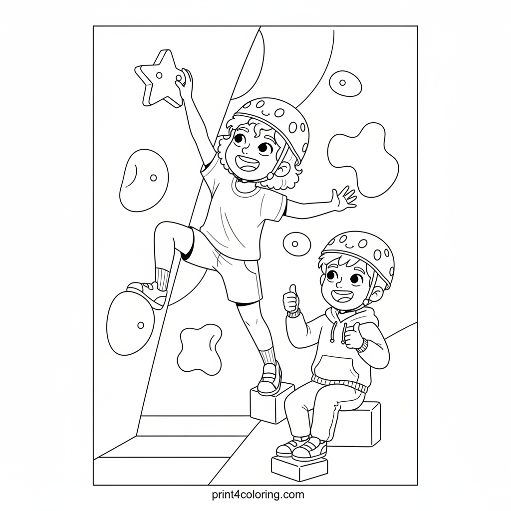 Join two brave friends on an exciting indoor climbing adventure! One child reaches for a vibrant handhold, showing determination, while their teammate offers an encouraging thumbs-up. Both wear safety helmets, ready to conquer the wall together. This page celebrates friendship, bravery, and the thrill of new heights.