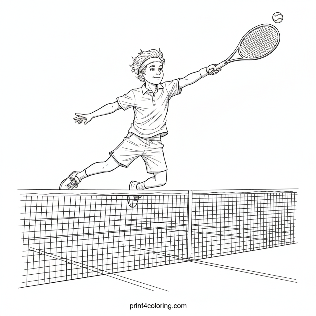 Witness the thrilling moment a young tennis player soars through the air, racket poised to send the ball flying over the net! This dynamic scene captures all the excitement of a match, with detailed court lines, realistic net weaving, and the player's athletic gear showing incredible motion. Get ready to color this energetic sports masterpiece!