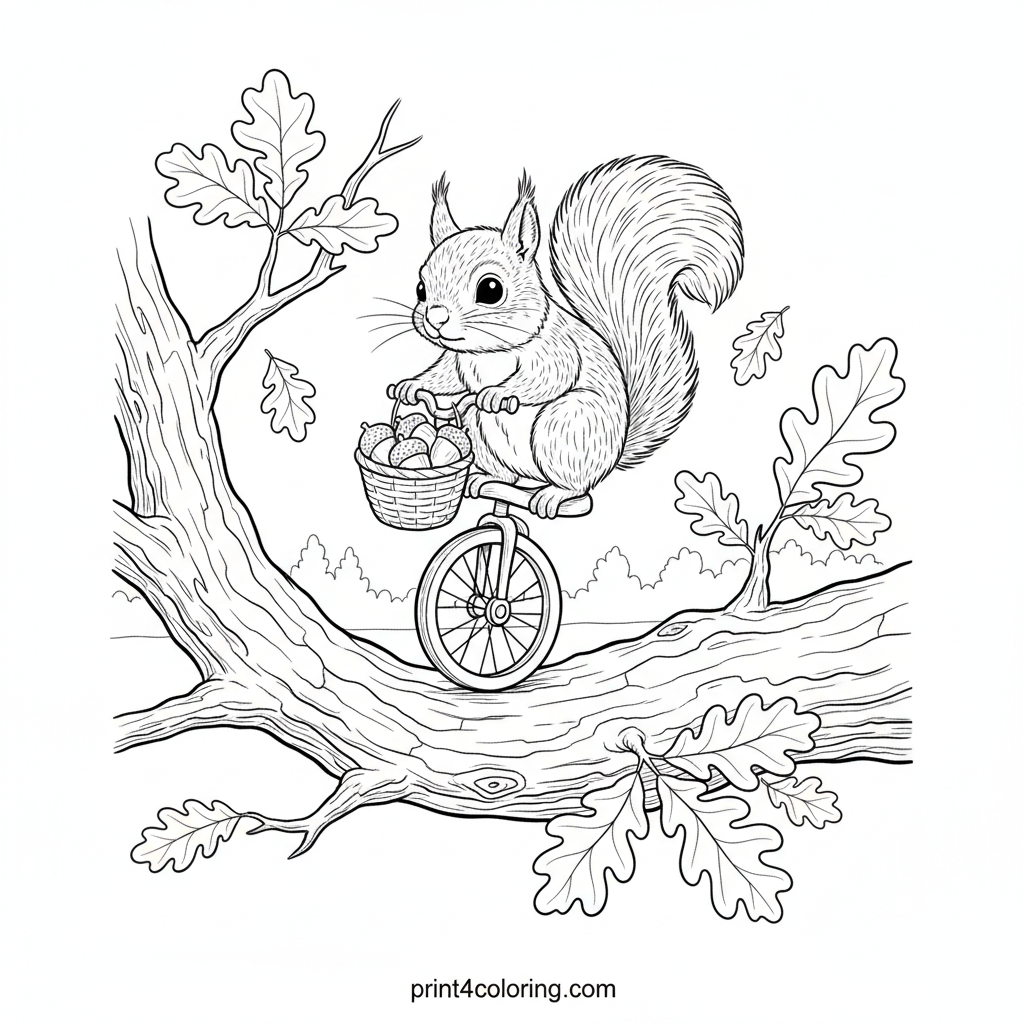 Get ready to color a delightful scene! A clever squirrel with a determined look expertly balances on a tiny unicycle, carefully transporting a basket overflowing with acorns. This charming moment unfolds on a detailed tree branch with textured bark and intricate leaves, perfect for bringing to life with your favorite colors. Imagine the adventure!