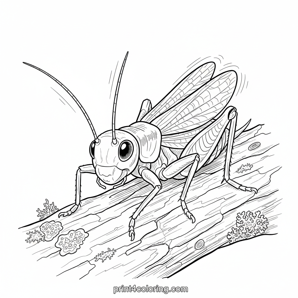 Listen closely to the sounds of twilight! This intricate coloring page captures a robust cricket, a true night musician, as it stridulates its wings to create a beautiful song. Explore the textures of weathered tree bark, delicate moss, and lichen as you bring this nocturnal scene to life. A perfect challenge for detailed coloring.