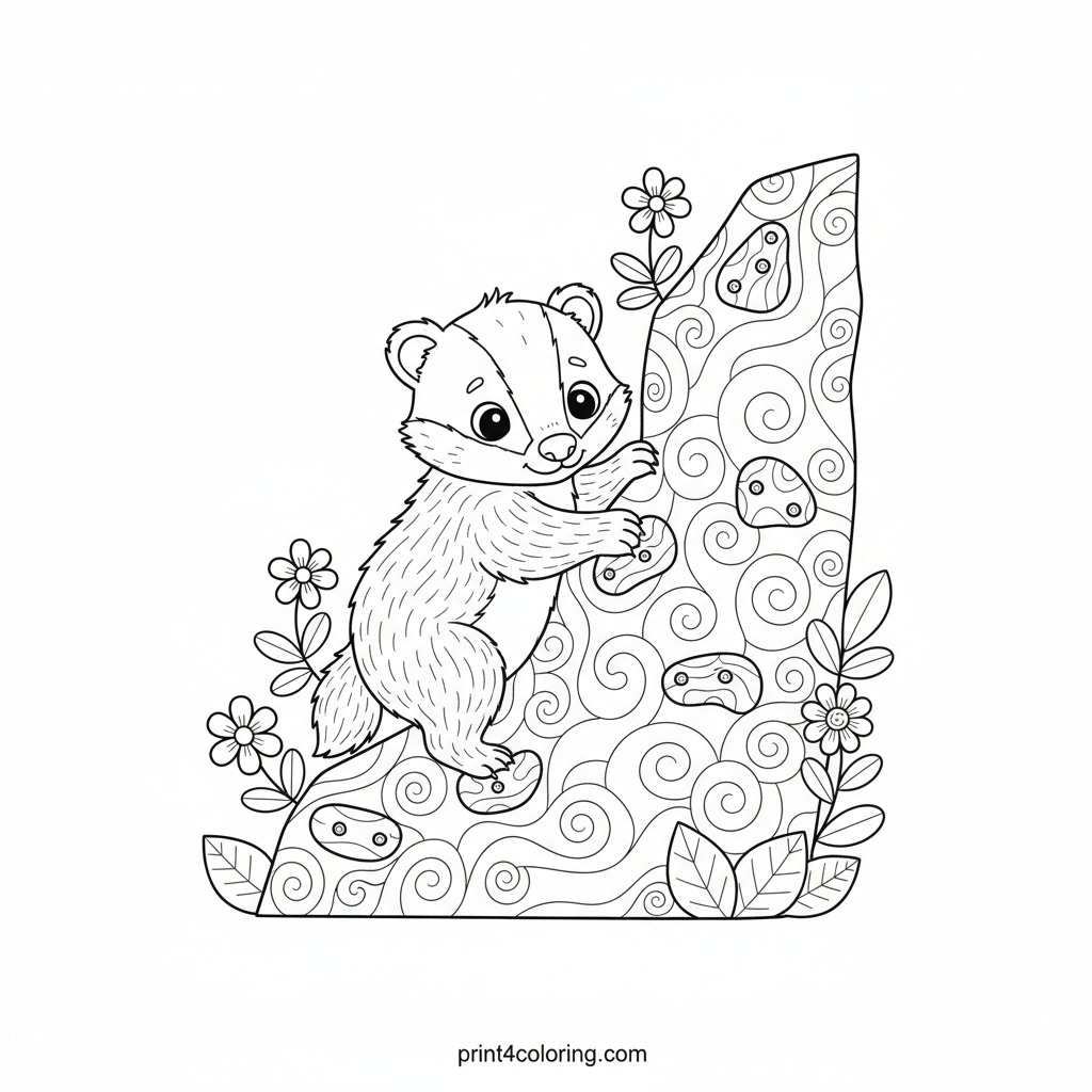 Join our brave badger cub on an exciting climb! With wide, curious eyes and a determined spirit, this fluffy explorer navigates a gently sloped rock wall. Adorned with intricate zentangle-like patterns, friendly handholds, and delicate leaves, this scene promises a delightful challenge for your coloring adventure.
