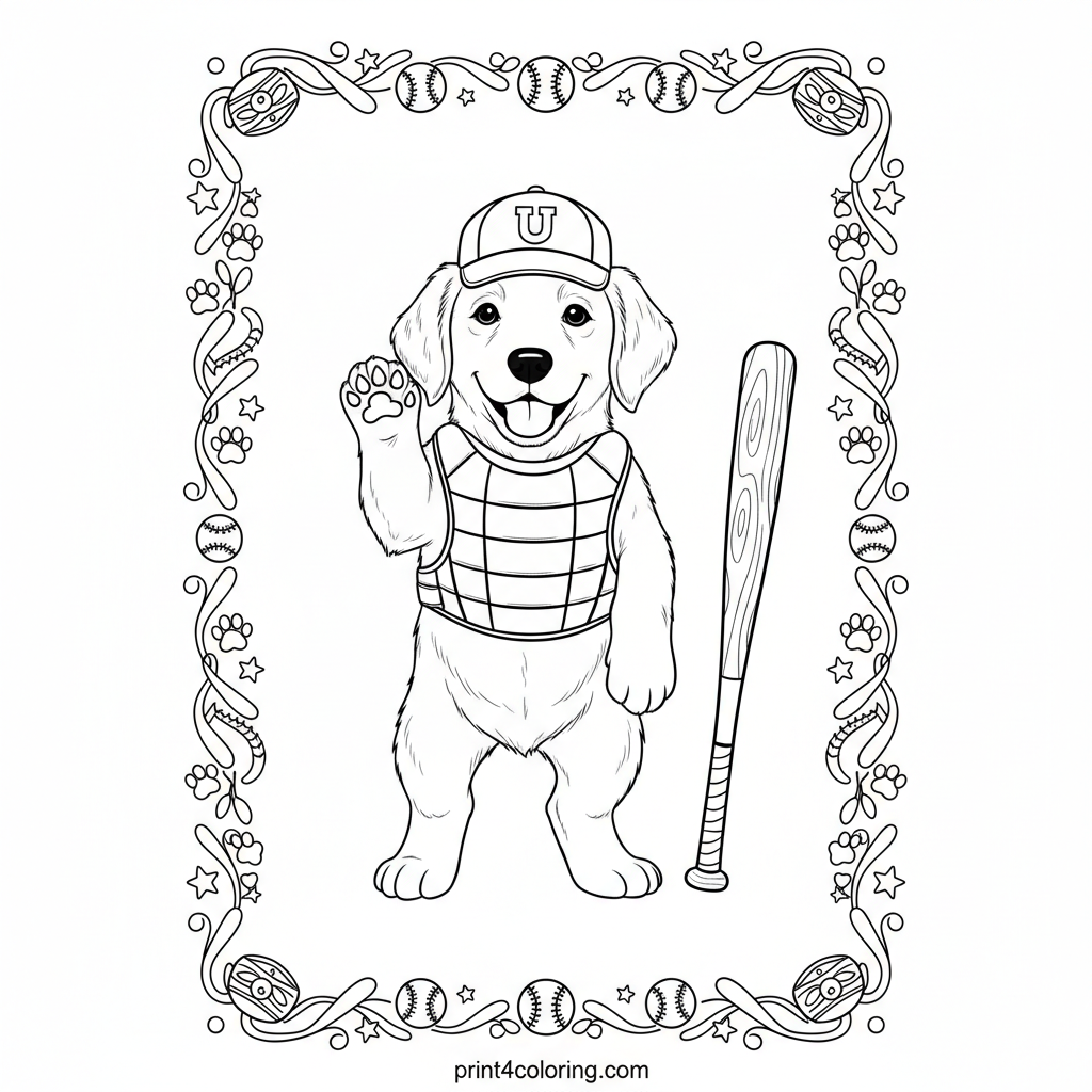 Step up to the plate with this adorable golden retriever umpire! Wearing a tiny cap and chest protector, this friendly pup is ready to make the big call. With a baseball bat nearby, it’s a playful scene perfect for young sports fans. Get ready to color every detail, from its wagging tail to the pattern frame!