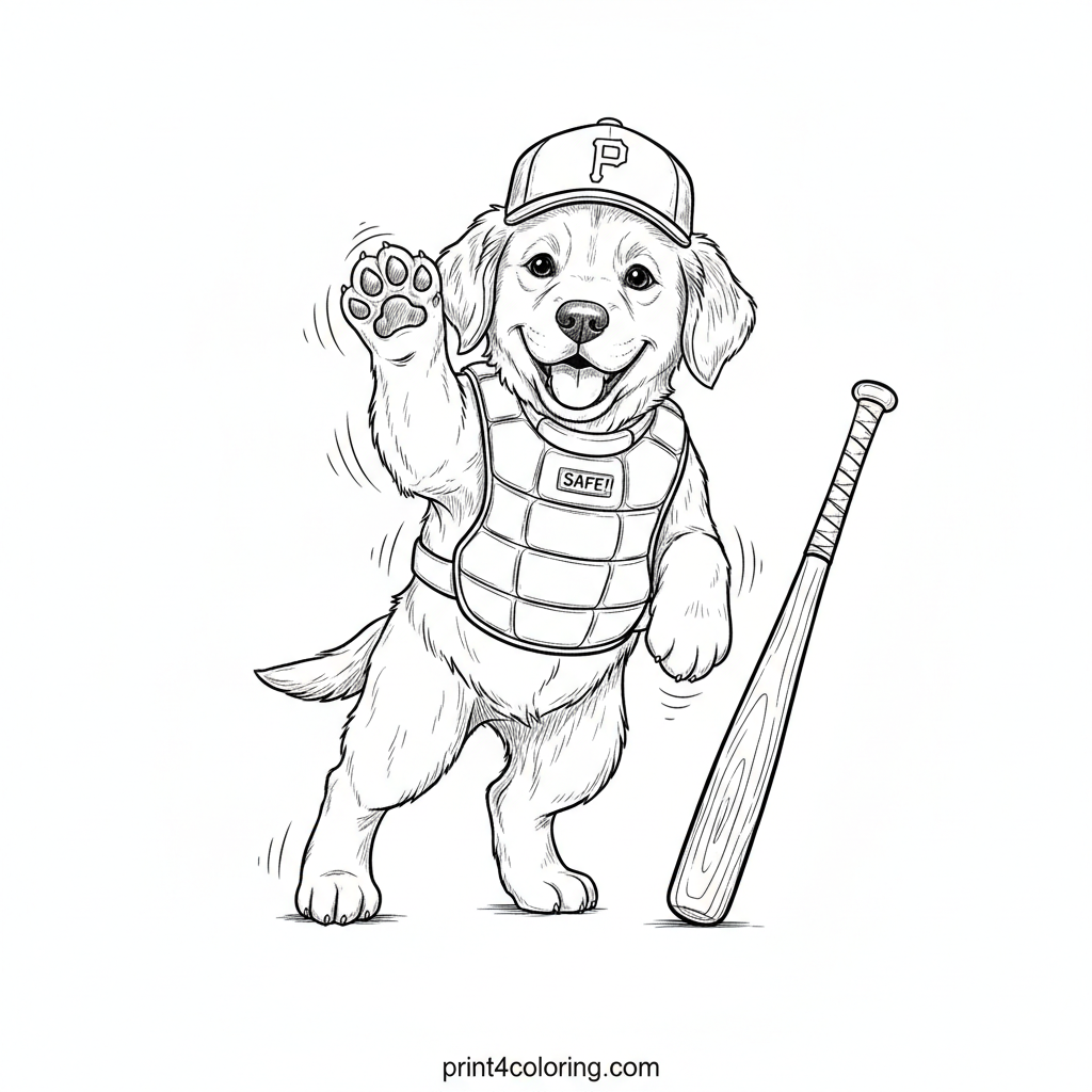 Step up to the plate with our adorable Golden Retriever umpire! This detailed scene captures a friendly puppy, decked out in a tiny umpire's cap and chest protector, making an important call on the field. With one paw raised and a baseball bat nearby, itβs a playful moment waiting for your vibrant colors. Get ready for some barking good fun!
