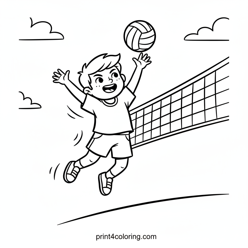 Get ready to color an amazing scene! A cheerful cartoon child leaps high, arms extended, with a happy and determined smile, about to powerfully spike a volleyball over the net. Capture the excitement of the game as they soar through the air, ready to score a point!