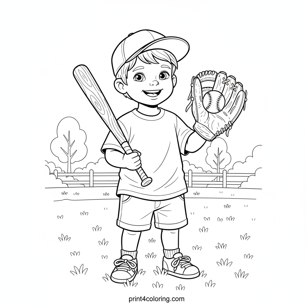 Get ready to play ball with this adorable scene! A proud little leaguer, just 4-5 years old, beams with joy, sporting an oversized baseball glove and holding a bat. Their cap is charmingly crooked. Enjoy coloring the detailed textures of the glove's leather, bat's wood grain, and baseball's stitches, bringing this future star to life!