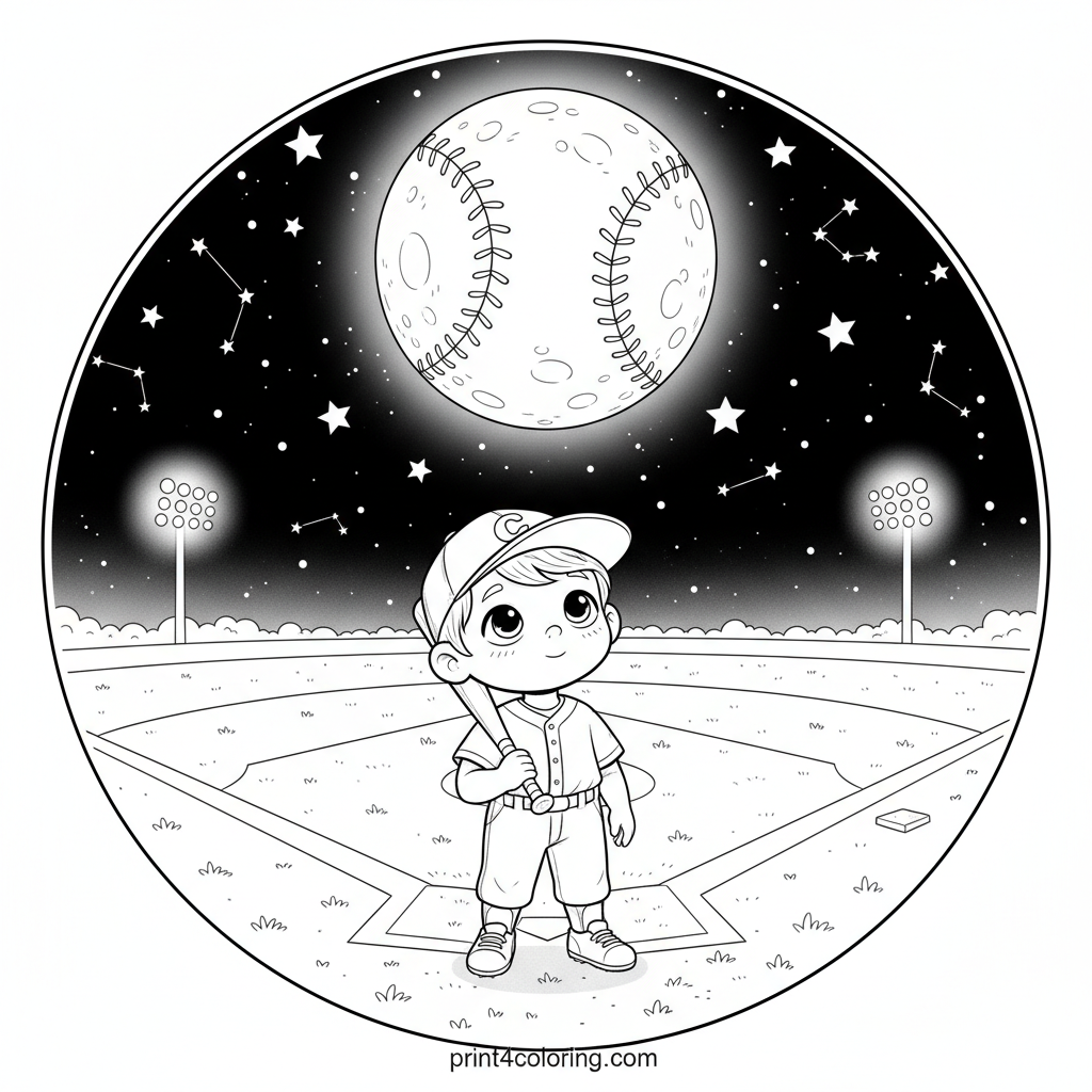 Imagine a magical night where a lone player dreams of a perfect game. This coloring page features a serene baseball field bathed in soft moonlight, with a giant full moon resembling a baseball. Twinkling stars and gently glowing stadium lights add to the quiet wonder of this enchanting scene, inviting you to color a truly special moment.