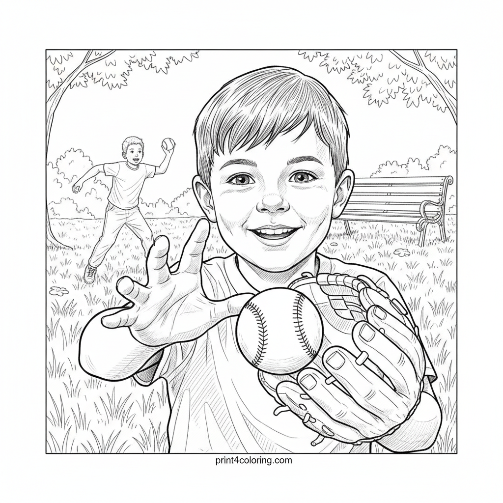 Capture the excitement of a perfect day in the park! This detailed coloring page features two friends or siblings playing catch. One child is keenly focused, reaching for the ball in the foreground, while the other smiles from the background. Bring to life the sun-dappled grass, distant trees, and a classic park bench with your vibrant colors.